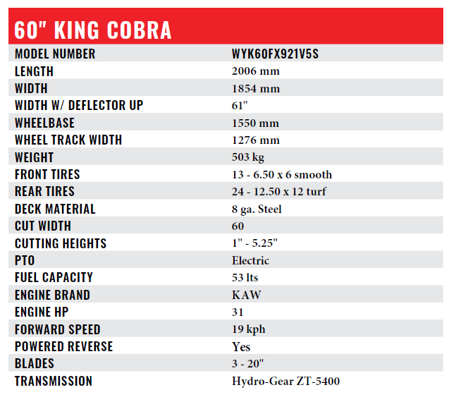 The heavy duty King Cobra zero-degree-turn riding mower was built with the bottom line in mind. With world-class components like a Kawasaki FX series engine, a Hydro-Gear ZT-5400 powertrain and a single point height setting with four fine adjustments, the King Cobra will deliver the perfect cut every time.